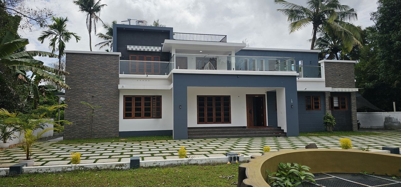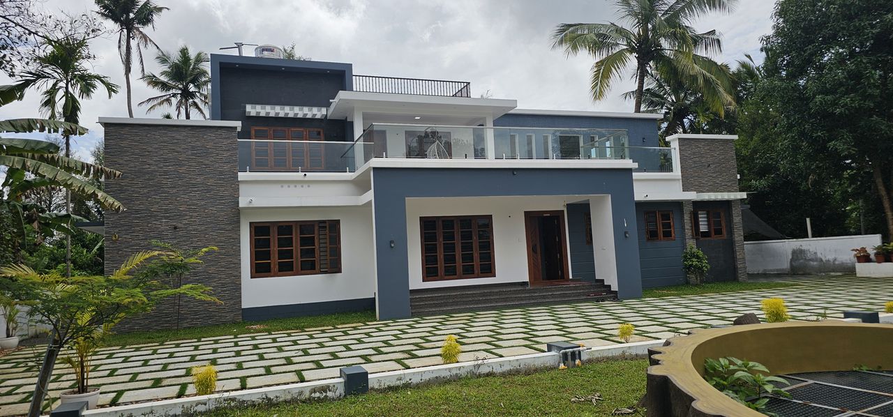 This contemporary front elevation for Seby Residence in Muringoor is designed with a focus on modern aesthetics, clean lines, and functional living. The elevation reflects a perfect balance between minimalism and elegance, making it ideal for modern Kerala homes.